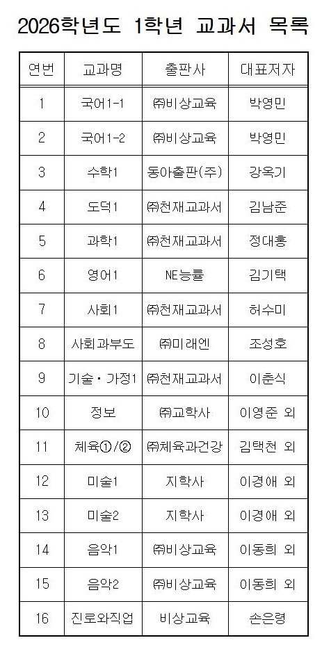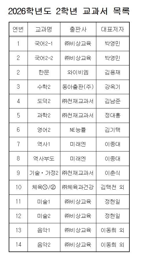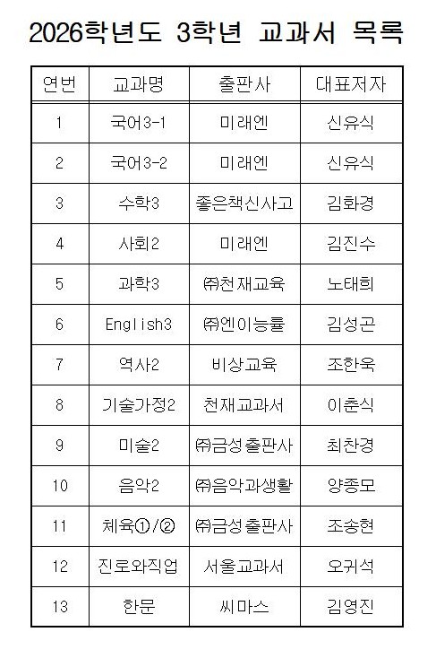 2026학년도 1,2,3학년 교과서 목록(출판사) 안내